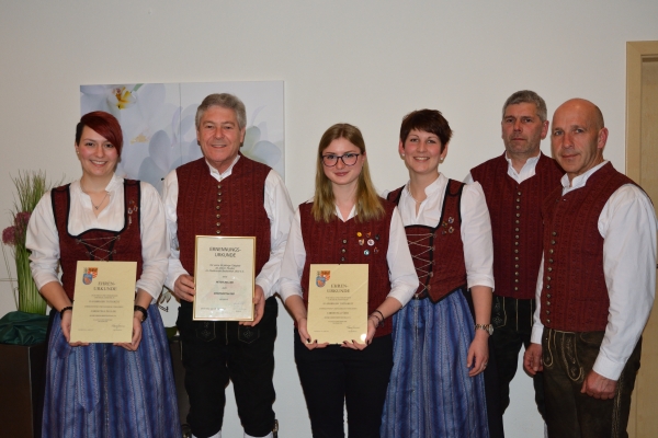 Christina Zeller (links) wurde für 15 Jahre geehrt, Christina Föhr (Mitte) erhielt die Urkunde für 10 Jahre aktives Musizieren.