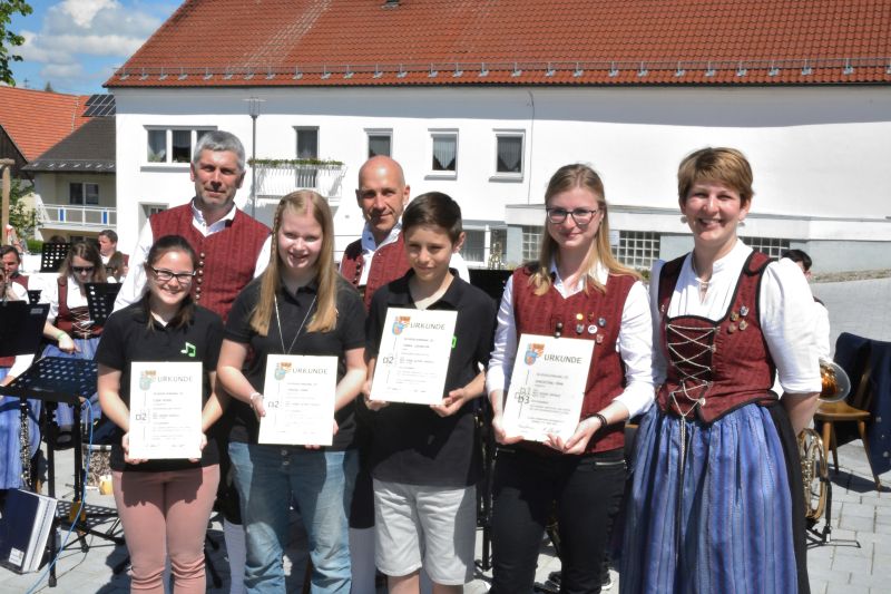 Frühschoppens auf. Bei dieser Gelegenheit überreichten unsere Vorstände Lisa Müller (rechts), Georg Lecheler (hinten links) und Reinhard Stegmann (hinten Mitte) die Urkunden für bestandene Bläserprüfungen an die erfolgreichen Absolventen. Über die bestandene D2 Prüfung freuen sich (v.l.) Lisa Riedl, Janina Föhr und Jonas Lecheler. Christina Föhr meisterte gar die D3 Prüfung. Herzlichen Glückwunsch!