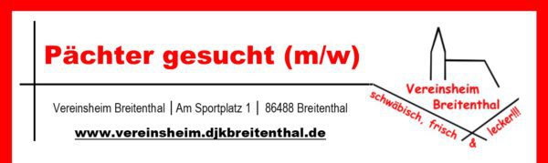 Leider hat Familie Rueff den Pachtvertrag für das Vereinsheim Breitenthal nicht verlängert und wir sind auf der Suche nach einem neuen Pächter (m/w).